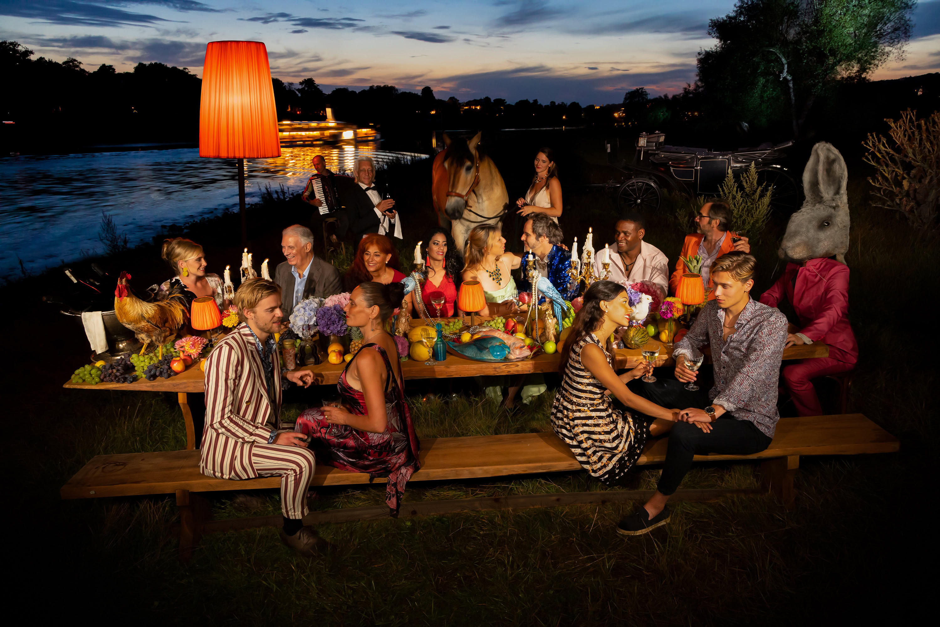 Wir sind Szenenbildnerin, Komponist, Fotografin, Maler, Dolmetscherin, Zeremonienmeister. Wir wissen, Feste beflügeln. Und wir sind Freunde. Wir produzieren für Mode, Theater, Showgeschäft, Museen und Messen; seit mehr als 20 Jahren. Wir sind salonfähig und schlagen über die Stränge.